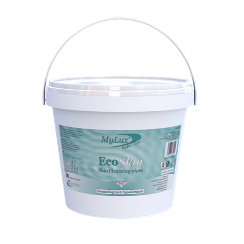Case of 4 handy resealable tubs of MyLux EcoSkin moist skin cleansing wipes. Made from a lightweight 100% polypropylene non-woven fabric. Tested both dermatological and hypoallergenic.