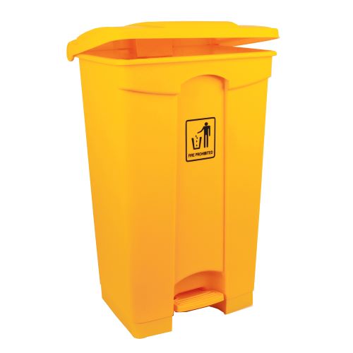 A sturdy foot operated bin made fro easy-clean hygienic polypropylene suitable for any environment. 87 Litre bin available in grey or yellow. Dimensions 85x50x41cm